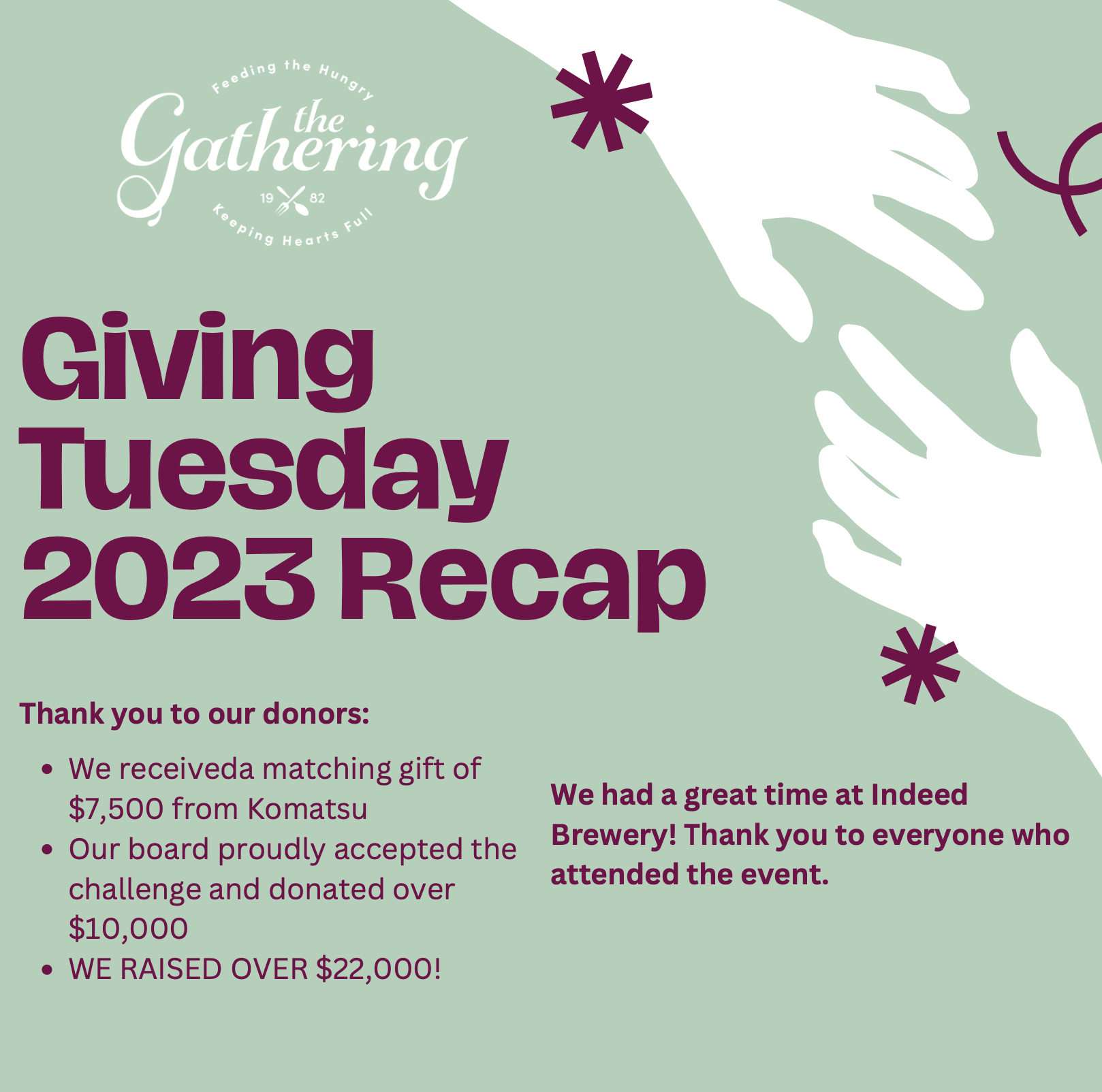 Giving Tuesday 2023 was a huge success! We raised over $22,000 with the help of our board and a $7,500 matching gift from Komatsu. We would like to thank Indeed Brewery for hosting our event and donating a percentage of their daily sales to The Gathering. We would also like to thank everyone who joined us and showed support to our community and mission. We can’t wait to see you all again next year!