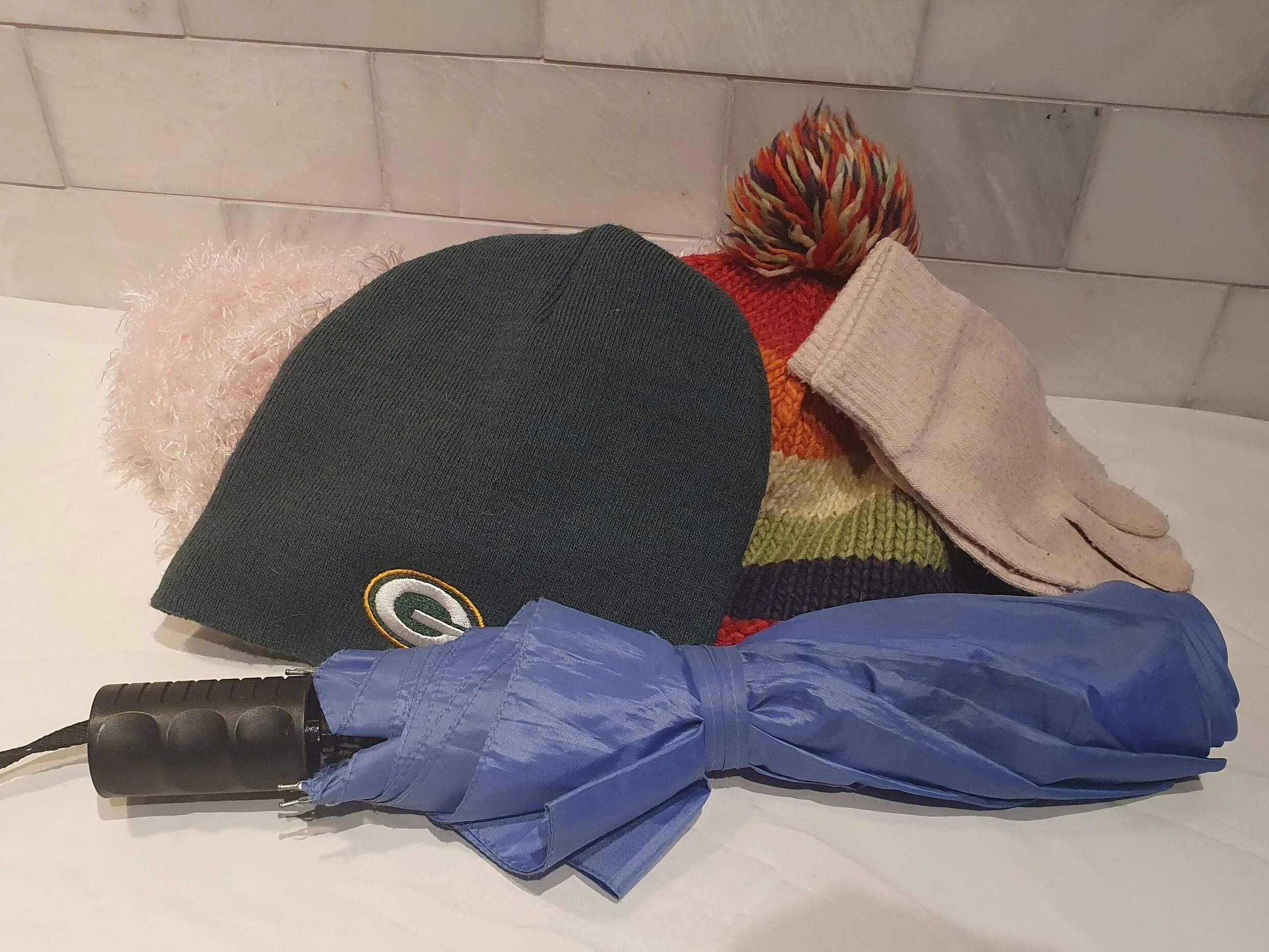 Scarves, gloves, hats, socks, boots, sweaters, coats, jackets, umbrellas and rain gear.