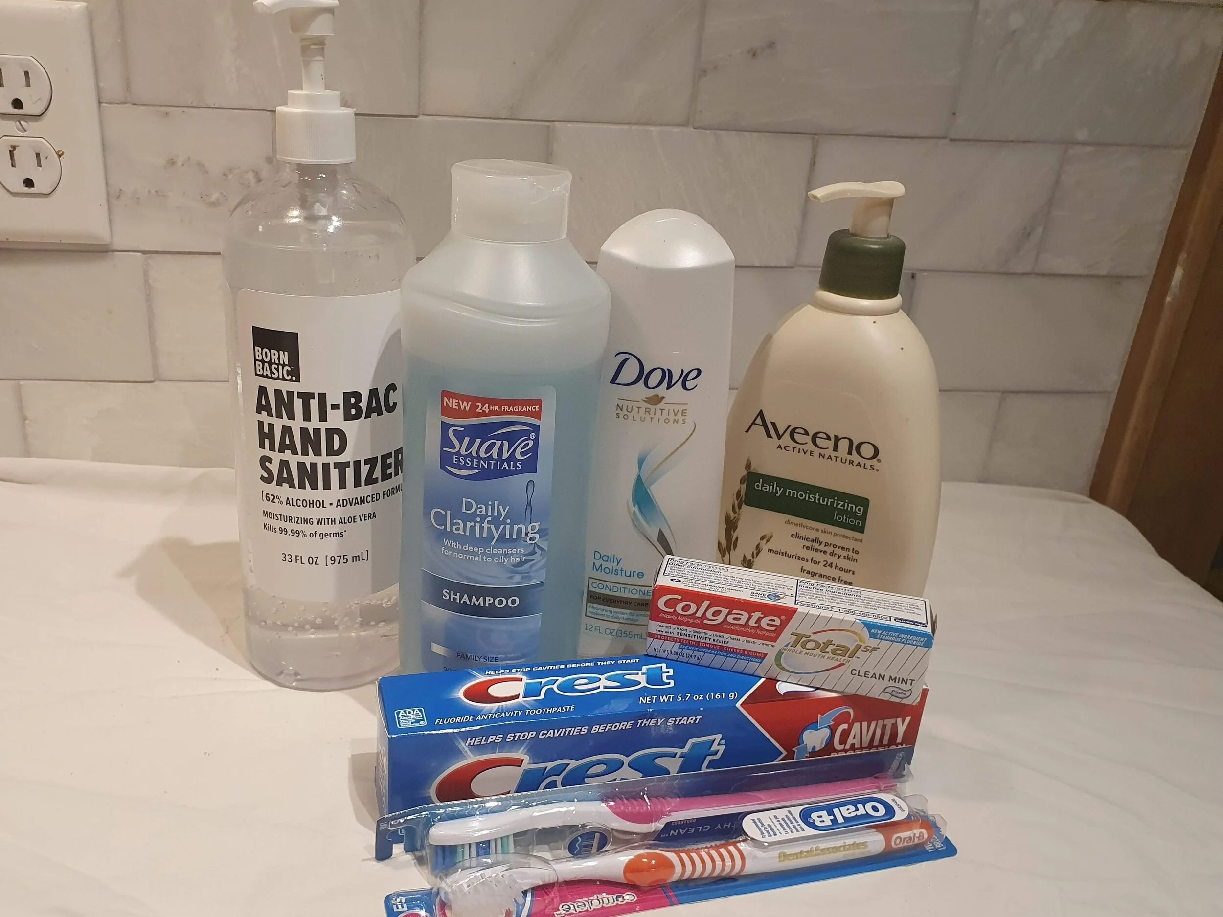 Soap, shampoo, toothpaste, toothbrushes, lotion, laundry soap, hand sanitizer and combs.